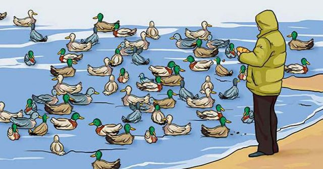 Start by observing the big picture. Don’t zoom in on any one part just yet; instead, take in the whole scene. Here, we have a person in a blue jacket standing by a lake, feeding a flock of ducks. It’s a peaceful and familiar sight—until you realize something is out of place.