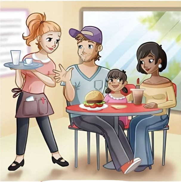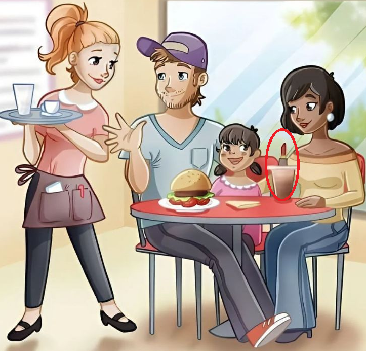 The scene features a family enjoying a meal at a cozy restaurant. A little girl sits between a man and a woman, smiling happily. The table is set with food and drinks, and a waitress is standing nearby, holding a tray with glasses and cups. Everything appears perfectly normal, but there’s a sneaky detail hiding in this seemingly simple moment.