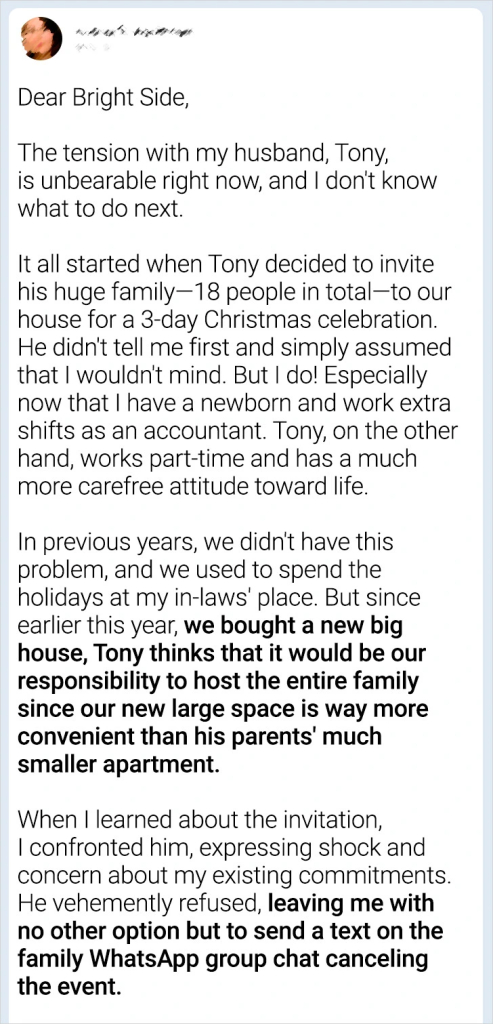 Open dialogue is key to resolving family conflicts. Rather than letting resentment build, Samantha can calmly share her feelings with Tony and his family. Explaining the challenges she’s facing—such as balancing a full-time job, caring for a newborn, and managing household responsibilities—may help others see the situation from her perspective.