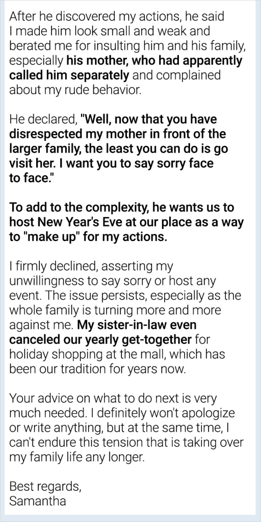 Family disagreements are never easy, especially when they involve in-laws and emotional misunderstandings. Samantha, a working mother and new parent, recently found herself in a difficult position when her husband, Tony, accused her of insulting his mother. To make matters worse, Tony demanded an apology Samantha felt was unjust. Let’s explore practical strategies for navigating such situations with empathy and maintaining healthy boundaries.