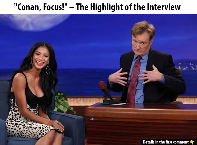 As the interview continued, Nicole answered one of Conan’s questions, only to catch him sneaking a glance at her chest. Without missing a beat, she humorously called him out by motioning from her chest to her eyes and playfully saying, “Conan, focus!”