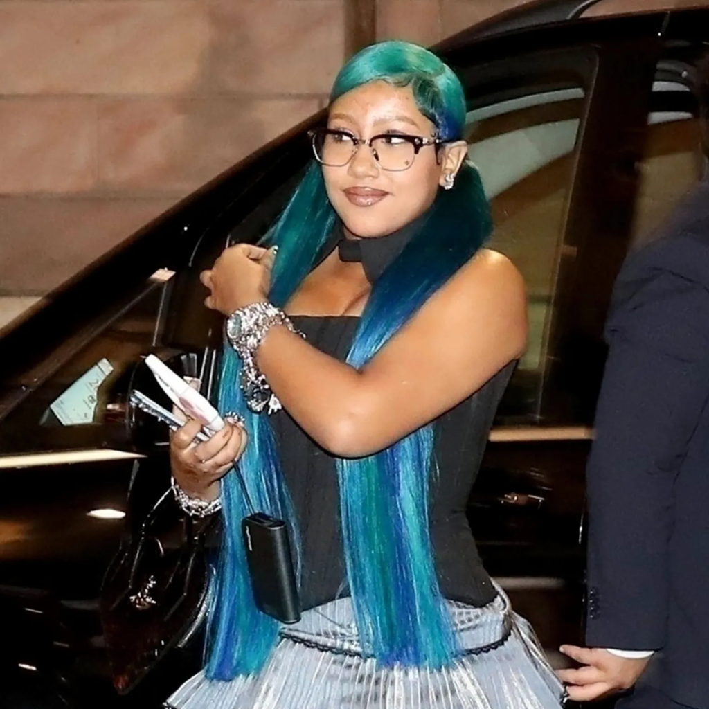 North, just 12 years old, surprised many with a look that blended high-fashion with youthful rebellion. She wore a black corset paired with either a denim mini skirt or lace detail skirt—depending on the source reporting the event. The ensemble was completed with high platform boots, blue ombré pigtails that shifted from green to black to electric blue, and designer accessories like Chrome Hearts glasses, a Vivienne Westwood heart-shaped bag, layered necklaces, and Hello Kitty accents.