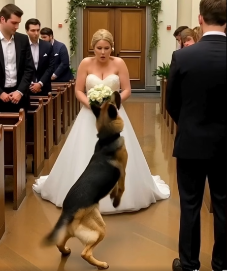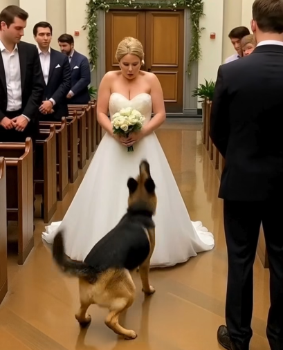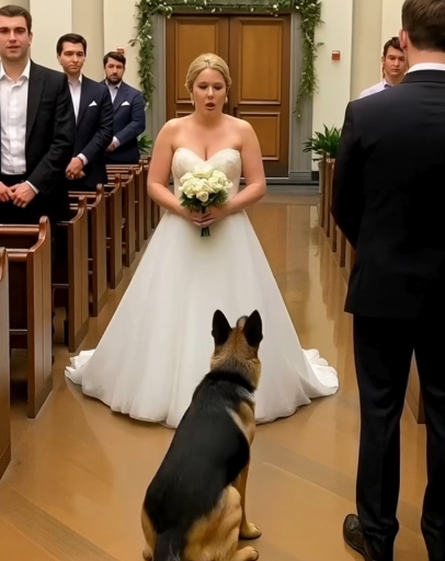 The soft music floated through the air, guests smiled with excitement, and the aisle—lined with white and green flowers—looked like something out of a fairy tale. Everything was unfolding exactly as planned until Neo, the family’s loyal German Shepherd, strode confidently ahead and stopped right in front of the bride, blocking her path to the altar.