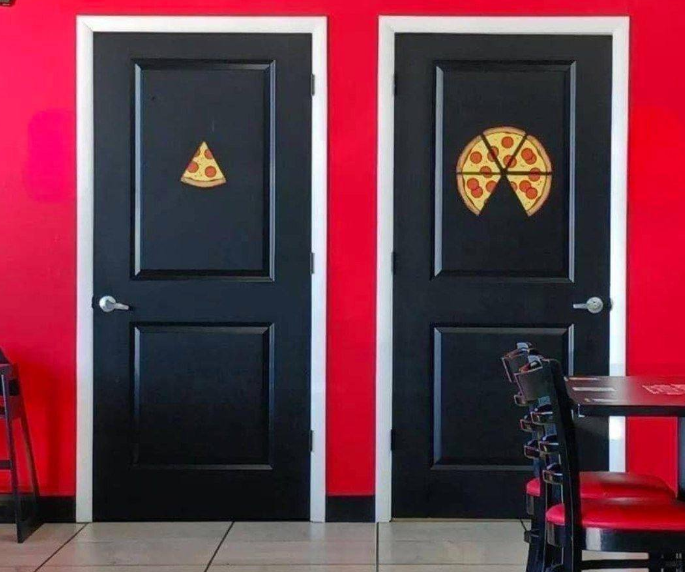 At first glance, the two restroom doors in this pizza shop look ordinary—until you notice the decals. One door features a slice of pizza, while the other displays a whole pizza with a slice missing. It seems simple, right? But here’s where the humor and brilliance come in: the design subtly indicates which door is for men and which is for women without using traditional gendered signage.