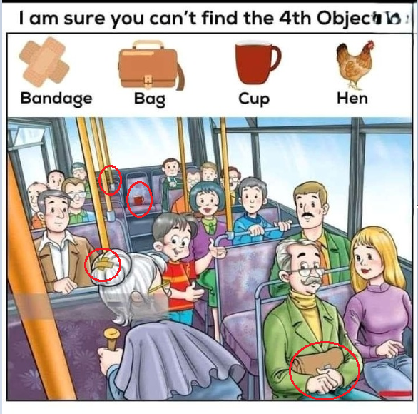 Here’s a challenge that’s been blowing up online—and it’s got everyone second-guessing their vision. Picture this: a casual, colorful scene of a busy bus ride. Nothing unusual, right? Well, not quite. Hidden somewhere in that scene are four random objects that don’t belong: a bandage, a bag, a cup, and… wait for it… a hen.