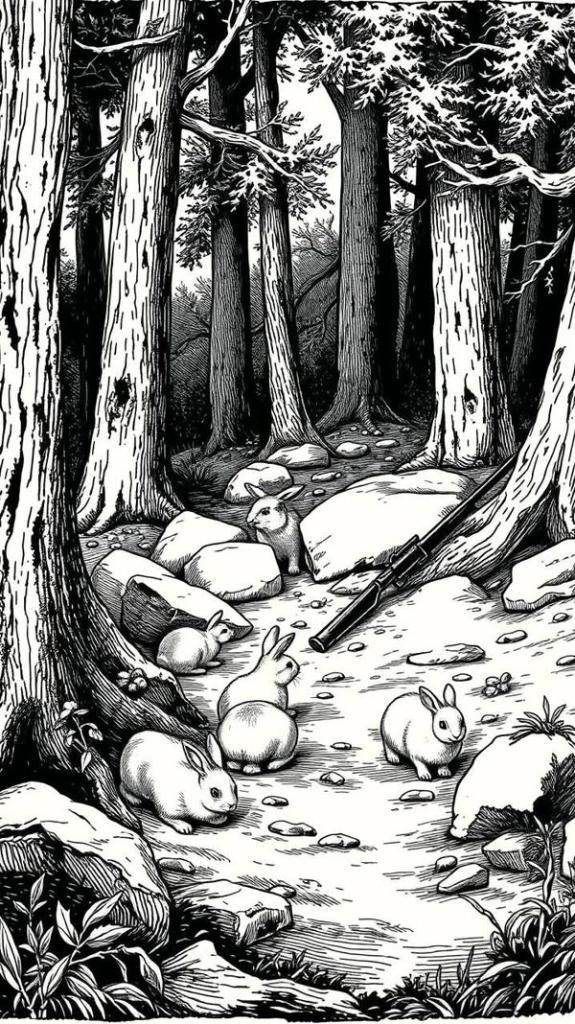 At first glance, it’s the kind of image that makes you want to take a deep breath and soak in nature. Soft sunlight filtering through towering trees, a carpet of moss underfoot, and a few cute rabbits hopping around — peaceful, right? But buried inside that calm, dreamy forest scene is something you weren’t expecting: a hunter. And not just any hunter — one so well-camouflaged, it’s a test of pure perception to find him.
