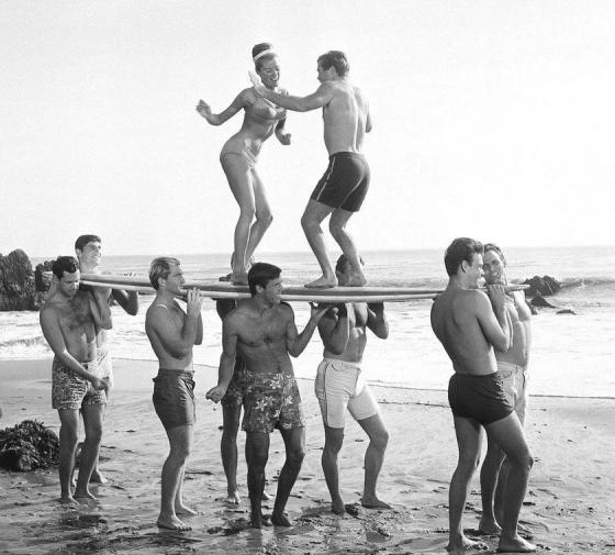 If you’ve ever wondered what pure joy, rebellion, and beach vibes looked like all rolled into one, just glance at this unforgettable photo. Snapped during a lively Malibu beach party in the early 1960s, it captures more than just a fun day at the shore—it freezes a moment in time when surf culture exploded and youth ruled the world. A bunch of sun-kissed friends lift a surfboard above their heads, balancing a smiling couple on top. She’s radiant in a vintage bikini and headband, while he rocks classic surfer trunks. The vibe? 100% carefree California cool.