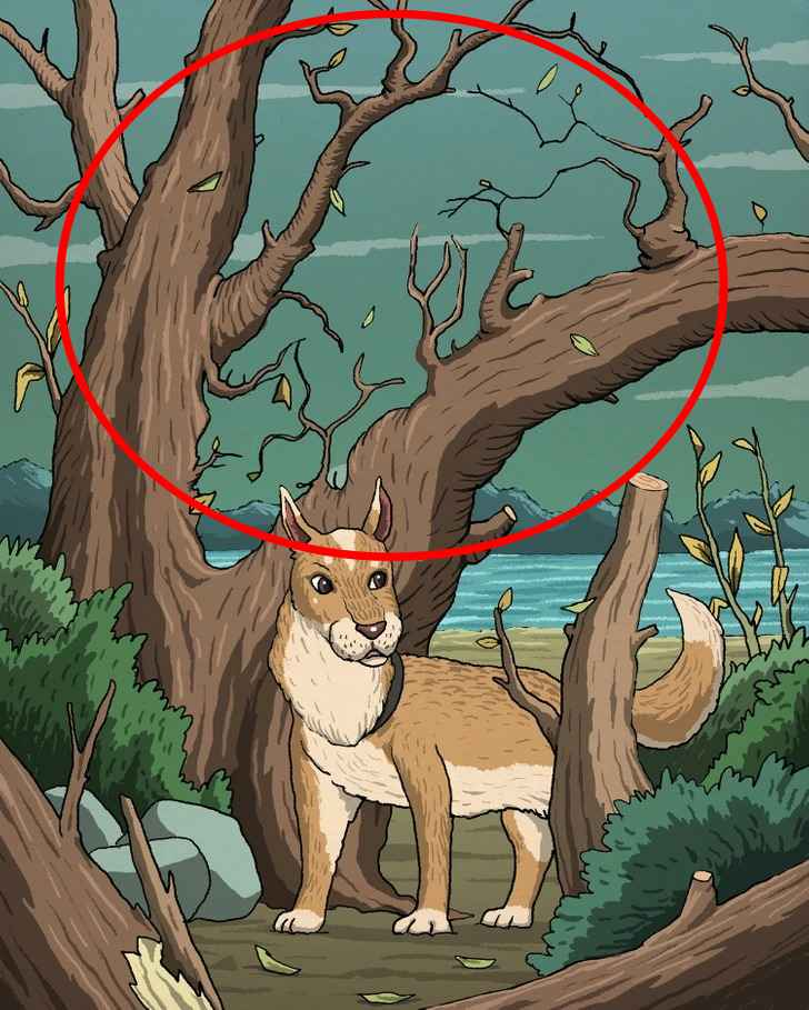 If you’ve been staring at the forest scene without luck, it’s time for a hint. The cat is blended into the contours of the tree, using shadows and natural lines to camouflage itself perfectly. If you focus on the branches near the trunk, you might start to notice an outline that looks more feline than floral.
