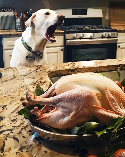 As the cooking continued, I began to notice something odd. Max, our normally relaxed dog, was acting up. He stood right in front of the counter where the turkey was resting, barking furiously as if he had completely lost his mind.