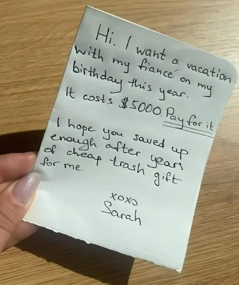 Our relationship with Sarah had always been built on love, support, and shared memories. We had given her handmade quilts, heirloom jewelry, and plenty of financial help over the years, believing these gestures truly meant something to her. But that illusion was shattered when we received a letter from Sarah just days before her birthday. Inside was a $5,000 quote for a vacation she wanted us to fund, accompanied by a note that read: “Pay for it. I hope you saved up enough after years of cheap trash gifts for me.”