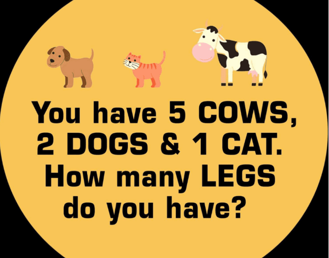 In the intriguing universe of puzzles and riddles, some questions are crafted to test not just your logical thinking but also to lead you astray. One such example is the seemingly straightforward query: “You have 5 cows, 2 dogs, and 1 cat. How many legs do you have?” At first glance, this appears to be a simple math problem, but lurking beneath the surface is a clever trick designed to deceive. Let’s break down this riddle and explore the intricacies of deceptive questioning.