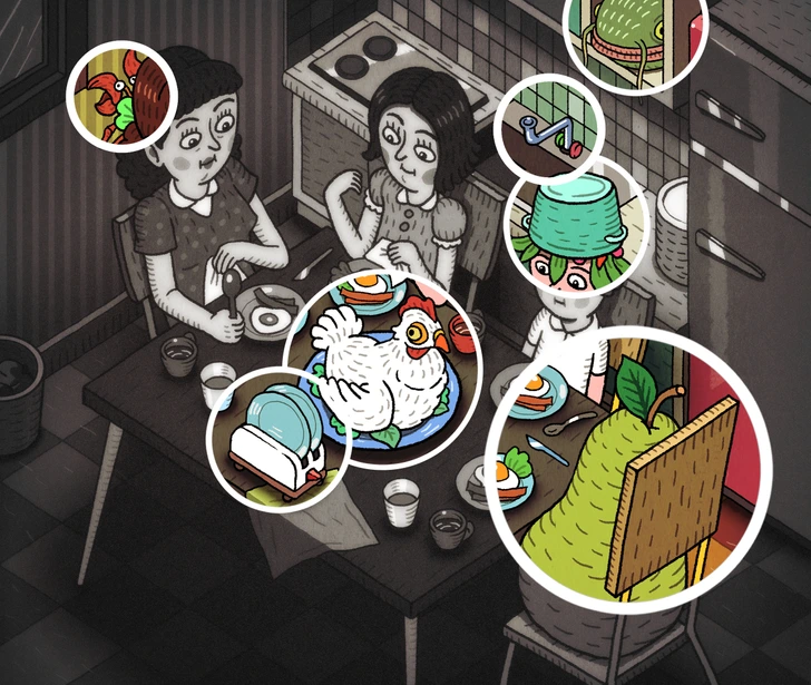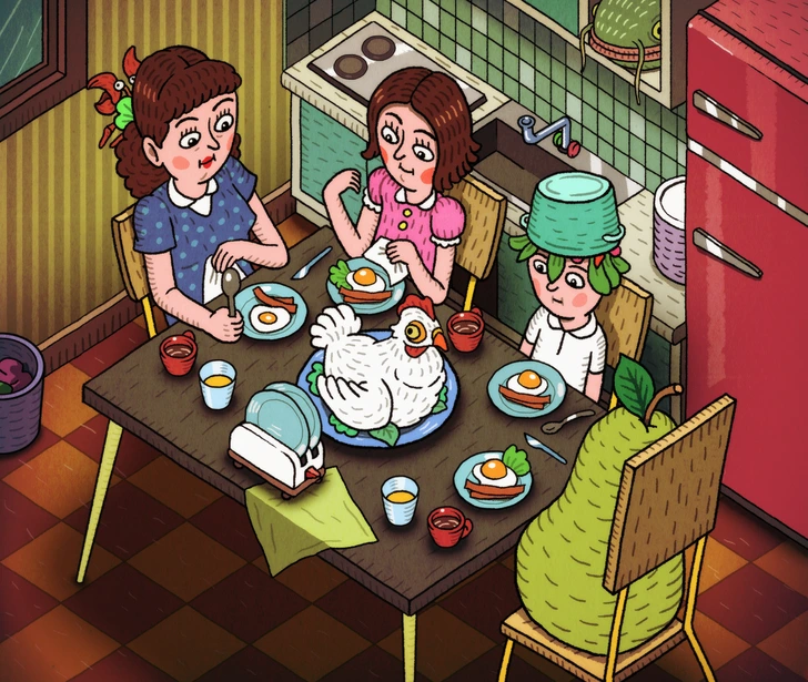 Now, shift your focus to the chair on the right side of the table. It’s not your typical wooden or plastic chair—instead, it’s shaped like a pear! Chairs usually come in standard designs, so finding one that looks like fruit is a clear sign that this scene isn’t entirely normal.
