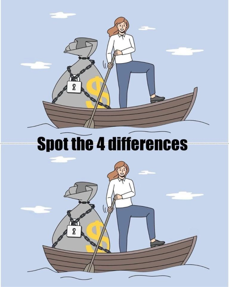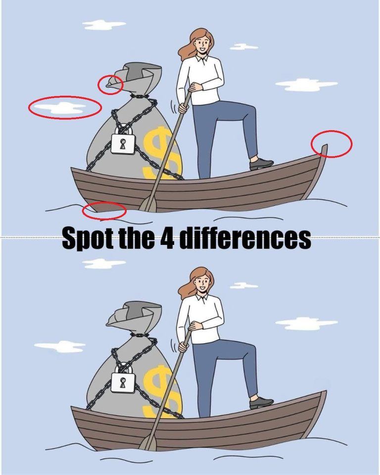 Are you ready to give your brain a workout? “Spot the difference” puzzles have been stumping and delighting people for decades. They seem easy… until you actually sit down and try to find every little change. Today’s visual challenge gives you two nearly identical images of a woman on a boat with a large bag of money—yet four clever differences are hidden in plain sight.