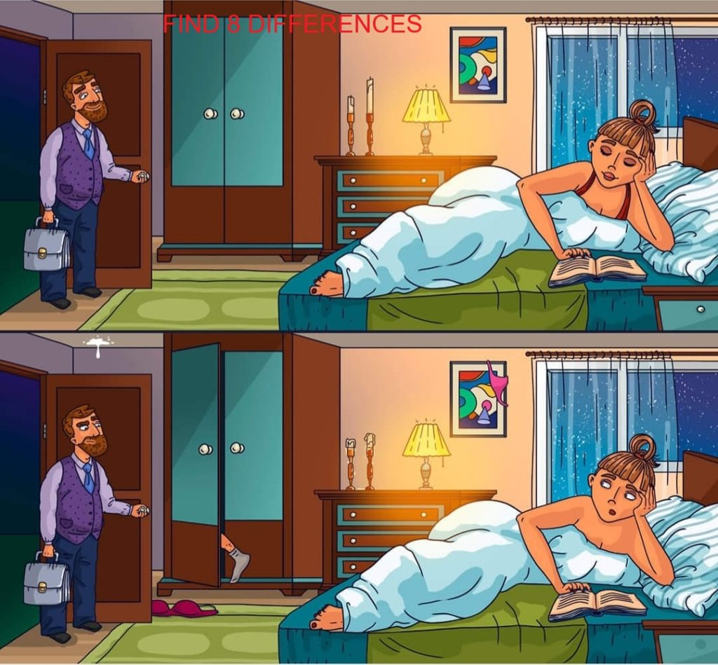 This one’s not even subtle once you see it. The closet door, closed tight in the first image, is cracked open in the second. And sticking out—just barely—is the unmistakable outline of a man’s leg.