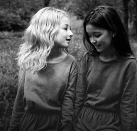 At first glance, the image seems simple enough: two young girls are seated in a serene woodland setting. The blonde girl looks directly at her brunette friend, who gazes downward. There’s nothing out of the ordinary—or so it seems.