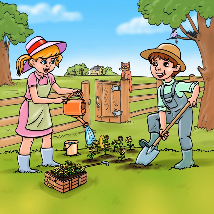 In the first image, we see two children busy in the garden. They appear to be working hard, but something doesn’t quite fit. Can you figure it out?