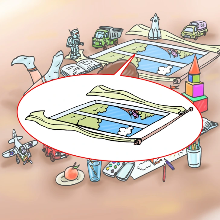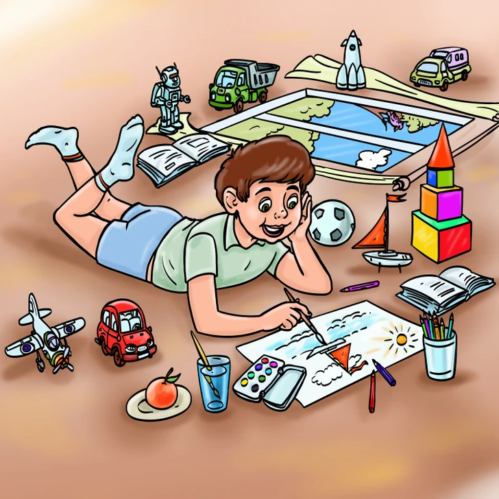 In this puzzle, a boy is lying on the floor, surrounded by toys, happily drawing. Seems normal, right?