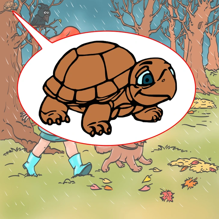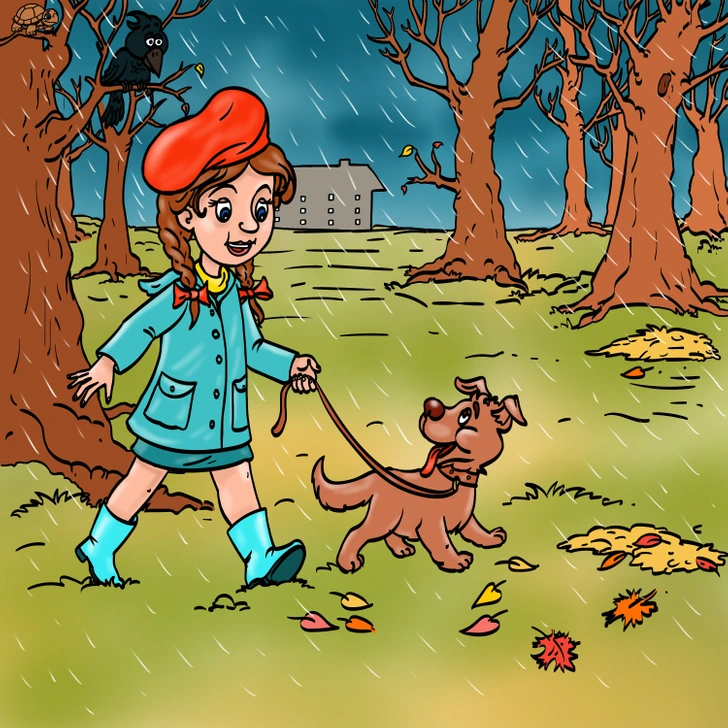 Here, a girl is walking her dog on a rainy day. She’s fully dressed for the weather with a raincoat and boots. But something isn’t adding up.