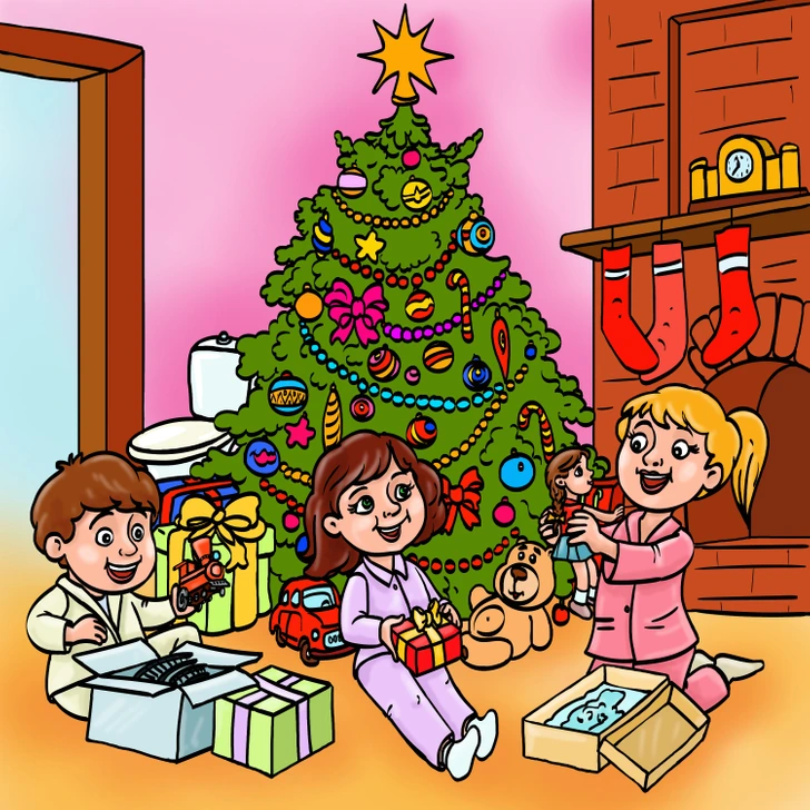 In this image, children are unwrapping presents under a beautifully decorated Christmas tree. Can you spot what’s wrong?