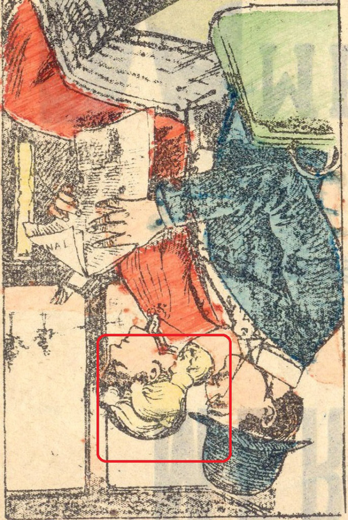 There he is—curled up near the bottom-right corner of the image, partially camouflaged by the shadows and patterns of the scene. His little face, a faint outline of arms, and subtle clothing colors make him incredibly easy to miss.