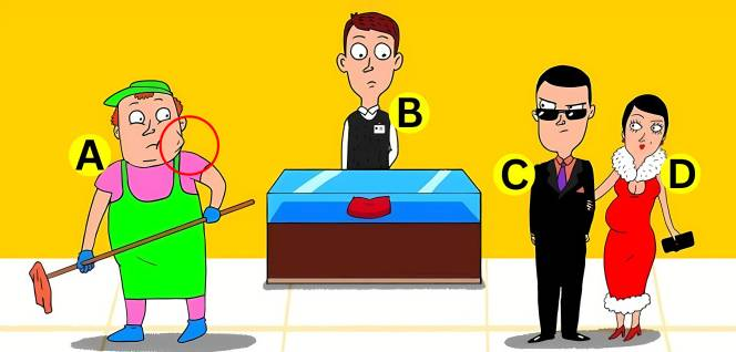 At first glance, suspect A seems innocent—just a cleaner with a mop, right? But look closer. What’s that in their mouth? If you pay attention, you’ll notice that suspect A appears to be clenching something. Could it be the missing diamond? This subtle yet crucial detail makes A the prime suspect.