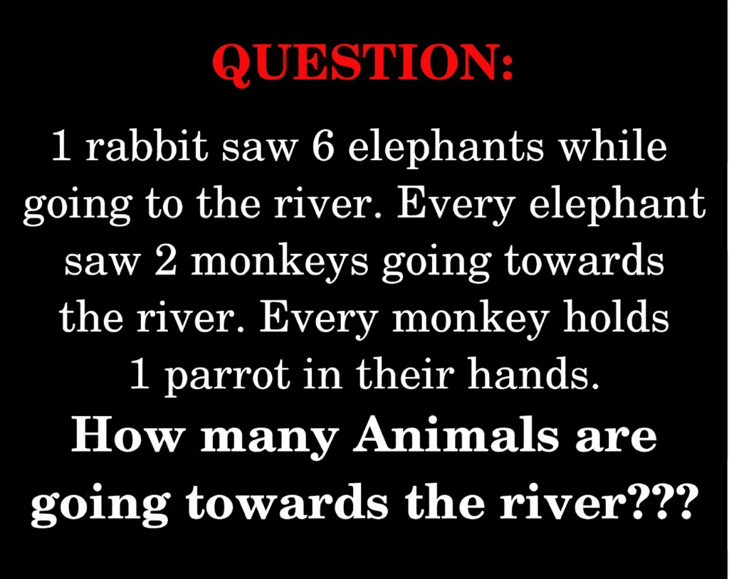 “1 rabbit saw 6 elephants while going to the river. Every elephant saw 2 monkeys going towards the river. Every monkey holds 1 parrot in their hands. How many animals are going towards the river?”