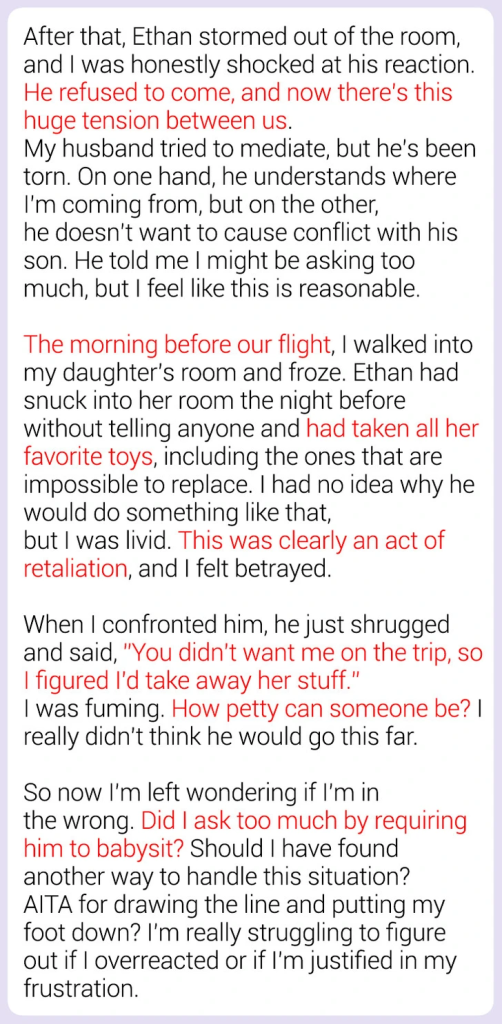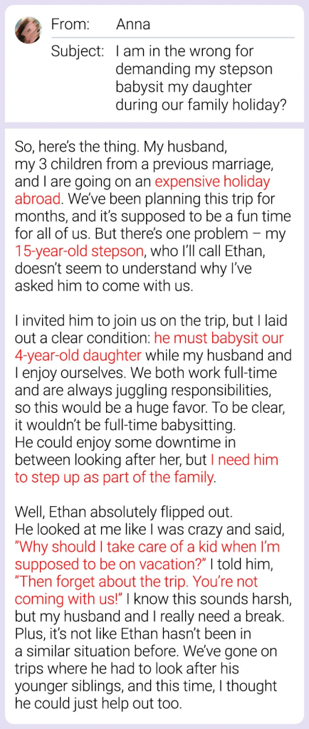 Asking a teenager to help out occasionally during a family trip isn’t inherently unreasonable. However, the way it’s presented matters. For Ethan, the request to babysit might have felt like an expectation rather than a choice. Teenagers, especially those in blended families, often walk a fine line between wanting independence and navigating their role within the family unit.