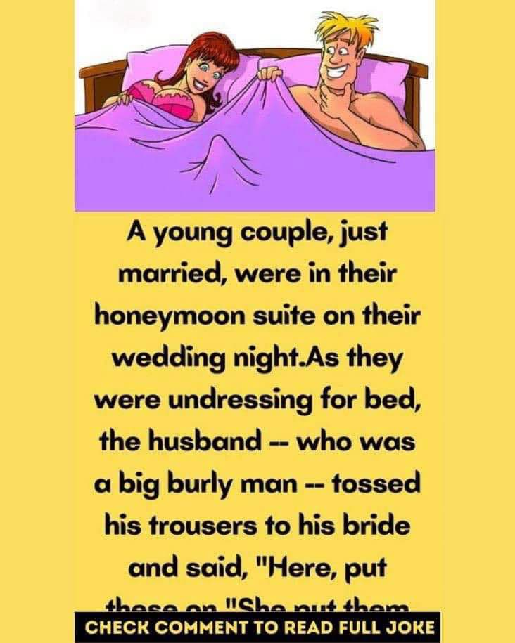 As he undressed for bed, the groom—a tall, broad-shouldered man—tossed his trousers toward his bride. With a grin, he said, “Here, put these on.”