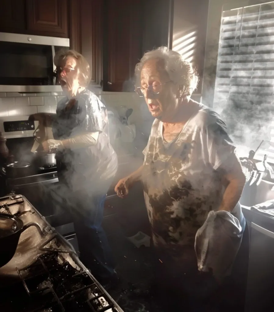 Inside, they found a scene of pure chaos. Margaret, Kira’s mother, and Rebecca, Michael’s mother, stood frozen like guilty children caught red-handed. Their faces were smudged with soot, the oven door hung ajar, and the source of the disaster—a turkey charred beyond recognition—lay smoking inside.