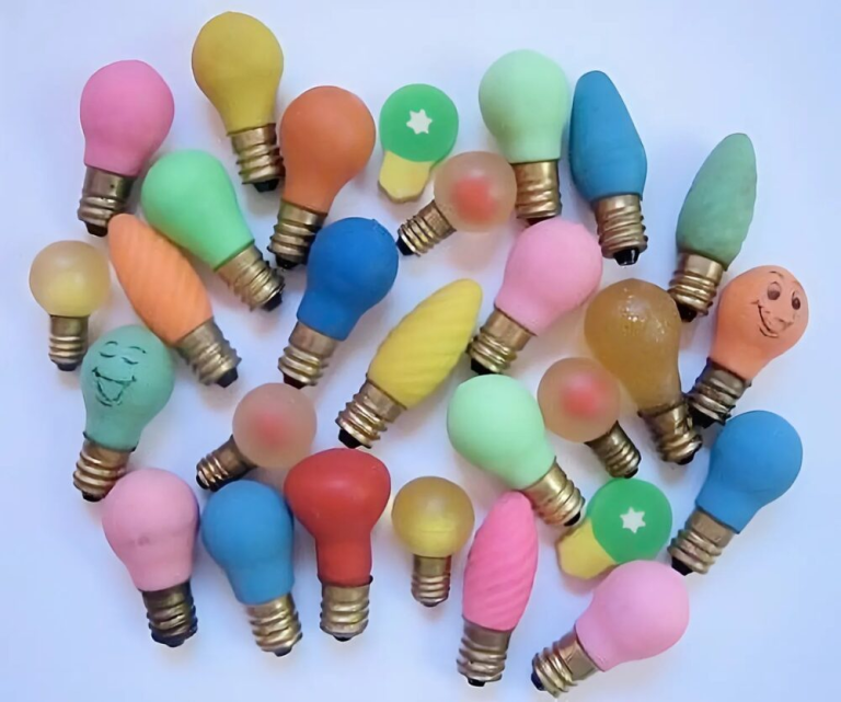 These little rubber novelties came in wild colors like hot pink, lime green, electric blue, and banana yellow. Most were shaped to look like old-fashioned incandescent bulbs—some even had a shiny silver base molded in. And while they proudly sat in our pencil boxes, let’s be clear: they erased absolutely nothing.