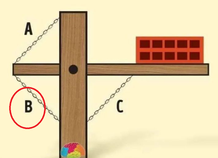 Chain C is located below the right side of the horizontal bar, directly under the brick. You might think breaking Chain C would cause the brick to fall, but that’s not the case. Why? Because Chain C experiences compression, not tension. It’s like pressing down on a spring – it doesn’t pull apart; it pushes together. So, even if Chain C breaks, the brick remains in place.