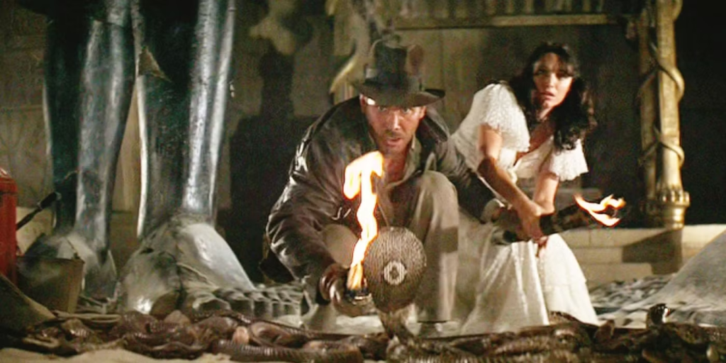One of the most iconic (and terrifying) moments in the film is when Indiana Jones faces a pit full of deadly snakes. But if you watch closely, in the scene where a cobra rears up in front of Indy, you can actually see its reflection on a glass panel separating Harrison Ford from the real snake. This was a clever safety measure for filming, but a small cinematic goof that made it into the final cut.