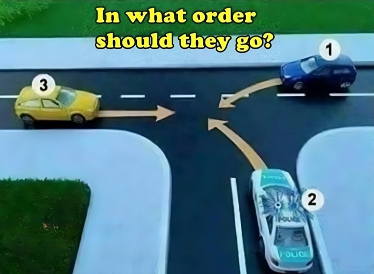 - Order: Police car (2) first, followed by car number 3 (going straight), and lastly car number 1 (turning).