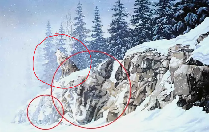 The third wolf is the trickiest of them all. It’s partially concealed by snow and shadows, blending seamlessly into the background. This wolf’s face is cleverly hidden within the interplay of light and dark. Look for areas where the contrast between light and shadow creates the illusion of a face. If you carefully scan the lower part of the cliff, you’ll spot the final wolf lurking in plain sight.
