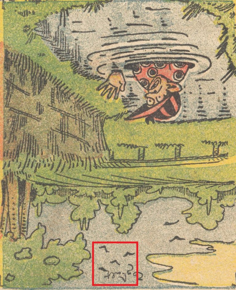 That’s the twist. The artist didn’t paint a monster surfacing from the water. Instead, they embedded a word-warning in the sky that only becomes legible when you invert the scene. Once you see it, you can’t unsee it. The danger isn’t a shadow in the reeds; it’s a message spelled above the splash, hinting at a nearby alligator and real risk for the man in the water.