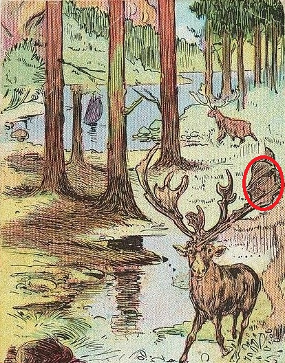 - Overlooking textures: The hunter’s face is disguised within the tree bark, making it look like part of the scenery.