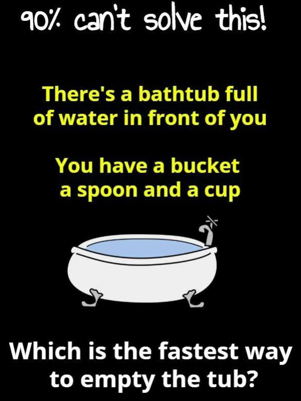 Life is full of little puzzles that make us stop and think, and this one is no exception: There’s a bathtub full of water in front of you. You have a bucket, a spoon, and a cup. Which is the fastest way to empty the tub?