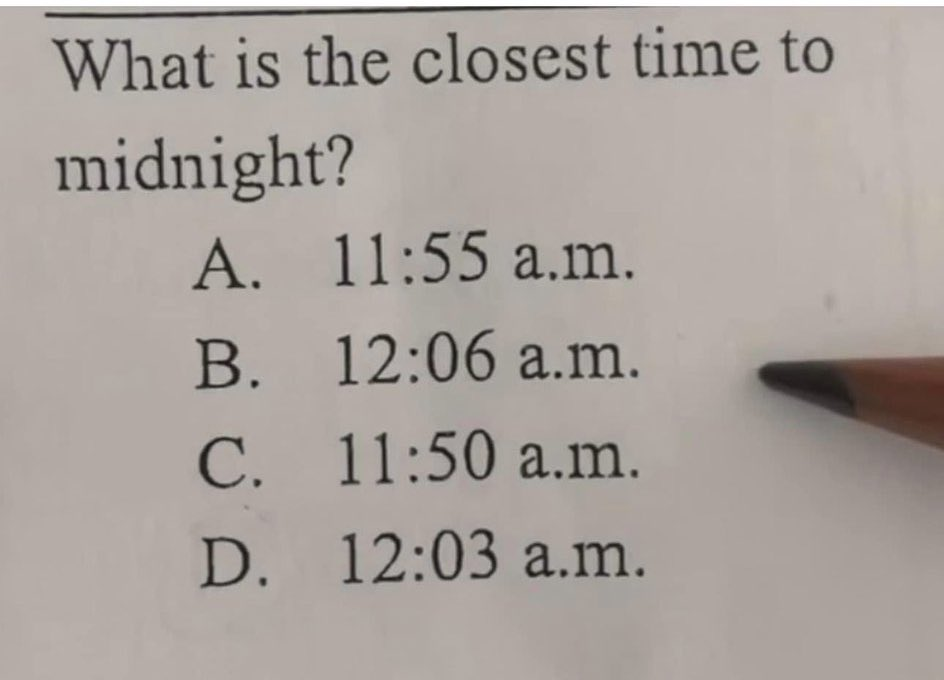 Then, there’s another group of thinkers who take a more literal approach to the puzzle. For them, the answer hinges not on the concept of time but on the physical positioning of the answers. If you look at the question on paper, 11:55 a.m. appears right before 12:03 a.m., making it closer to the word “midnight” in the list of choices.
