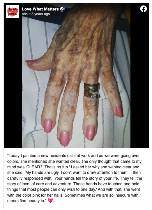 One commenter wrote, “My grandmother’s hands were just like this, and I always thought they were beautiful. Thank you for reminding me.” Another added, “This story brought me to tears. We all need to see ourselves the way others see us—with love and appreciation.”