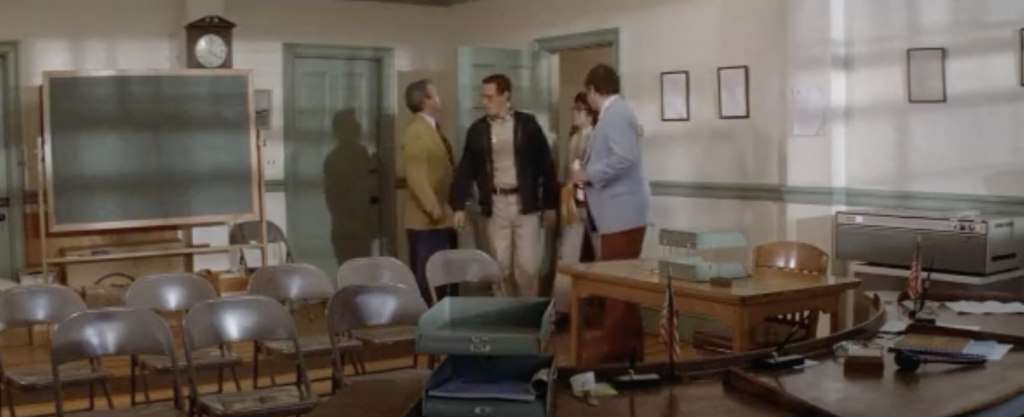 One of the most amusing and famous errors in Jaws occurs early on during the town meeting. Quint’s introduction, a scene where he makes his memorable “nails-down-the-blackboard” entrance, is full of tension. As the camera glides across the room, it comes to rest on a blackboard, which features a crude drawing of a shark. However, just a few minutes earlier, during a lighter discussion about the bounty for the shark, the blackboard is clean, free of any shark drawings. Did Quint really add that picture while everyone was distracted? Probably not. But does it matter? Not really. It’s a small detail that has become part of the movie’s quirky charm.