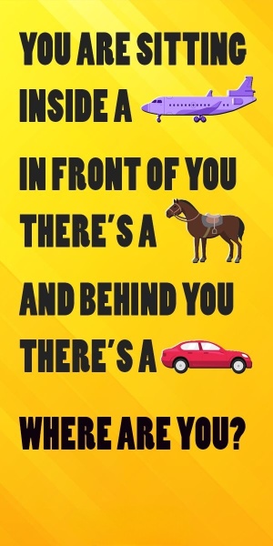 “You are sitting inside a (plane). In front of you, there’s a (horse). And behind you, there’s a (car). Where are you?”