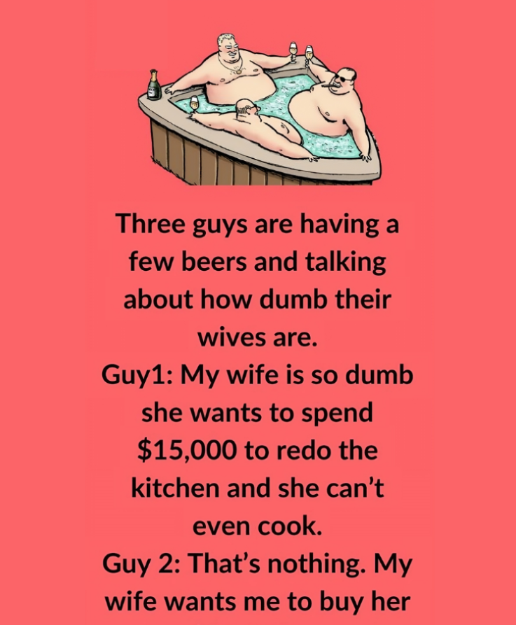 “My wife is dumber than both of yours. She bought three boxes of condoms to take on a business trip—and she doesn’t even have a dick!”