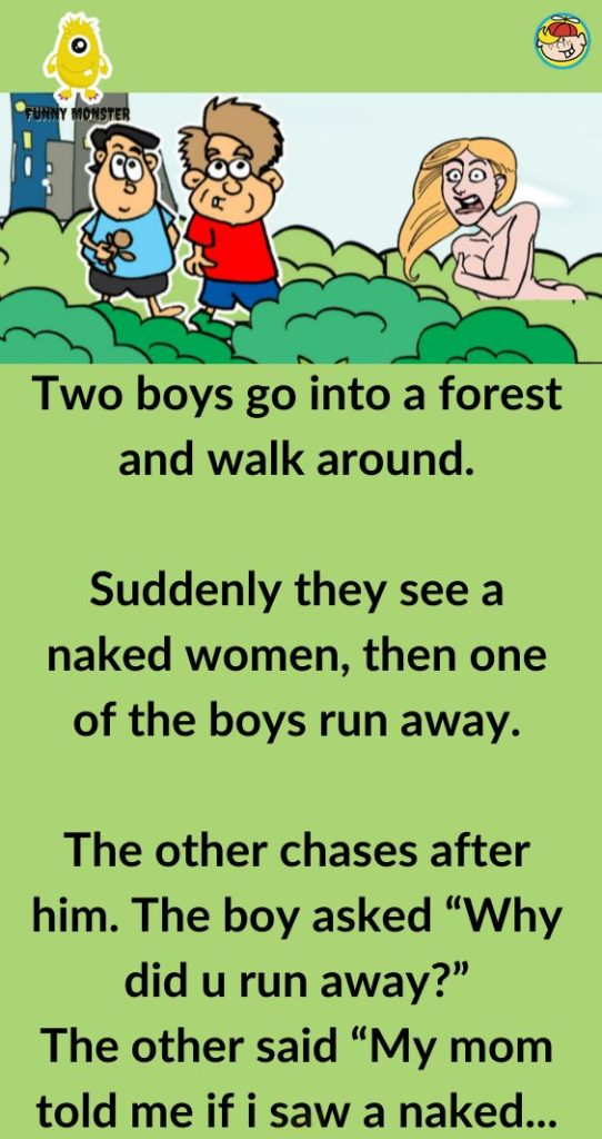 The first boy gasps for air and says, “My mom warned me—if I ever saw a naked lady, I’d turn to stone… and I swear something already started to feel stiff!”