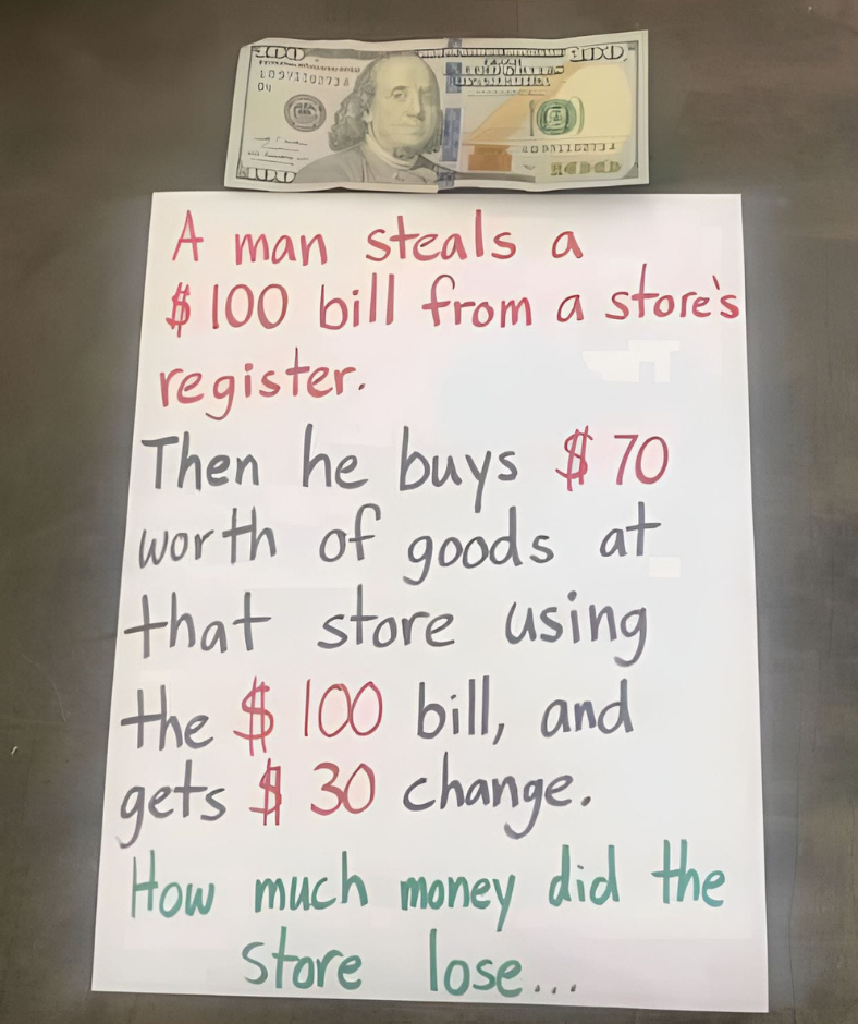 Next, the man spends the same $100 bill he stole to buy $70 worth of merchandise. He hands the $100 bill back to the cashier. While this momentarily seems like the store has regained its $100, they’ve now lost $70 in goods. Thus, we can say that the store’s total financial loss now includes the $70 worth of products taken by the man.