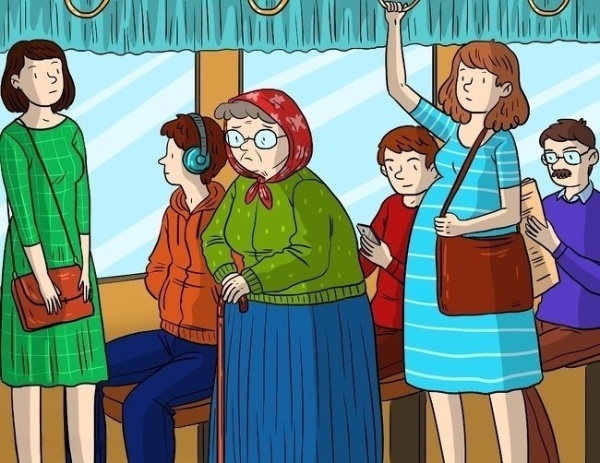 Solution: The missing element here is “chivalry.” In this scene, both the old woman and the pregnant woman could use a seat, but no one seems to be offering it to them. Did you catch it in time? How long did it take you to figure it out?