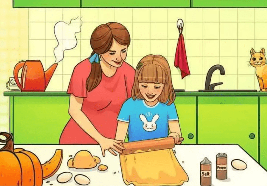 The picture shows a cheerful scene: a mother and daughter in the kitchen, preparing dough together. But if you look closely, something seems off. Study every corner, every detail, and every item in the image carefully. It’s trickier than it appears!