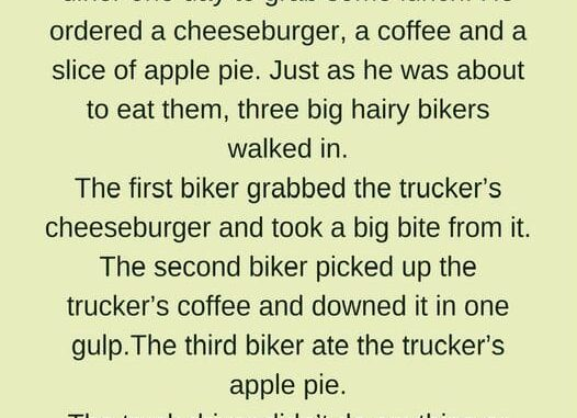 Finally, the third biker reached for the slice of apple pie, devouring it with smug satisfaction. The trucker, unfazed, simply stood up, walked to the counter, paid his bill, and left without uttering a single word.