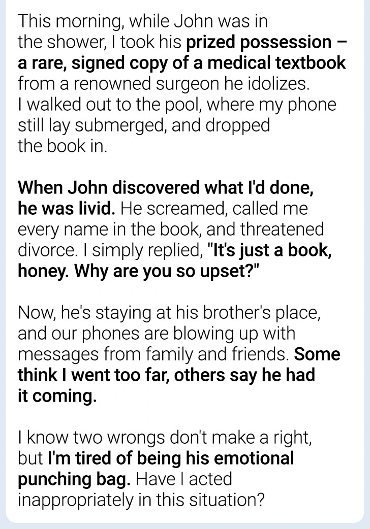 Have you ever been so frustrated with your partner that you considered throwing their most prized possession into the pool? Well, that’s exactly what Nara did in a moment of sheer desperation. Tired of dealing with her husband’s tantrums and childish behavior, she decided to teach him a lesson. But now, she’s grappling with the fallout—friends and family are questioning whether she crossed a line. So, what led to this drastic act? Was Nara justified in her retaliation, or did she go too far? Let’s dive into her story.