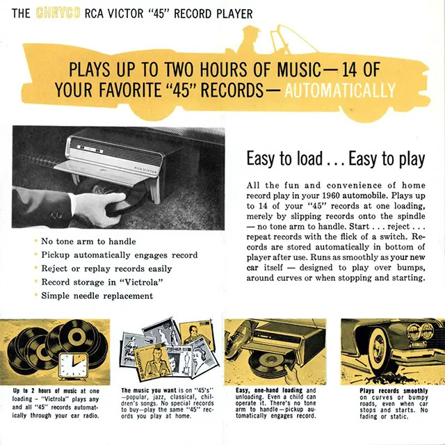 In 1960, Chrysler replaced the Highway Hi-Fi with a new system: the RCA Auto Victrola. Unlike its predecessor, this turntable played standard 45 RPM records, making it more appealing to consumers. The system allowed drivers to: