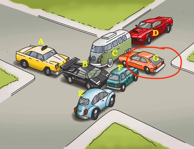 It’s Car G—the orange Pinto sitting off to the side. Unlike the others, Car G has the space to move backward. And that’s the golden key.